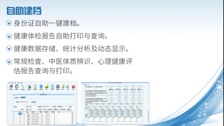 支持智能監測設備接入,進行數據的長期追蹤、分析與評估。數據按及地方標準建立,內置中醫體質辨識,醫生可現場分析中醫體質。